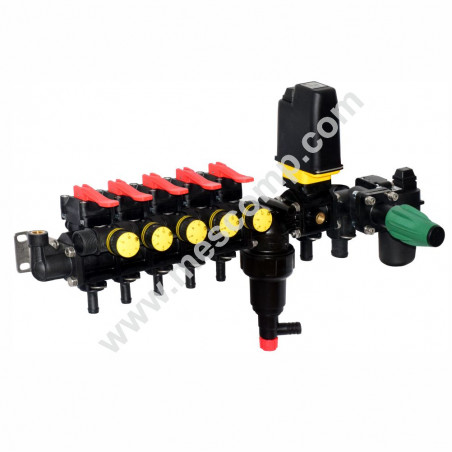 Dies ist ein manueller Verteiler, der manuelle Hauptventile und Druckregler durch elektrische Ventile ersetzt. Wir bieten Standardverteiler mit 3 bis 7 manuellen Abschnittsventilen und 0 bis 2 zusätzlichen manuellen Ventilen zum Anschluss von Rührwerken oder eines Mischers an. Wir können auch Schlauchverbinder in Ihrem gewünschten Durchmesser installieren.